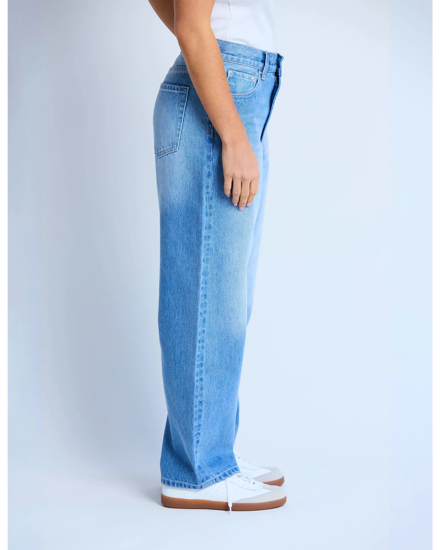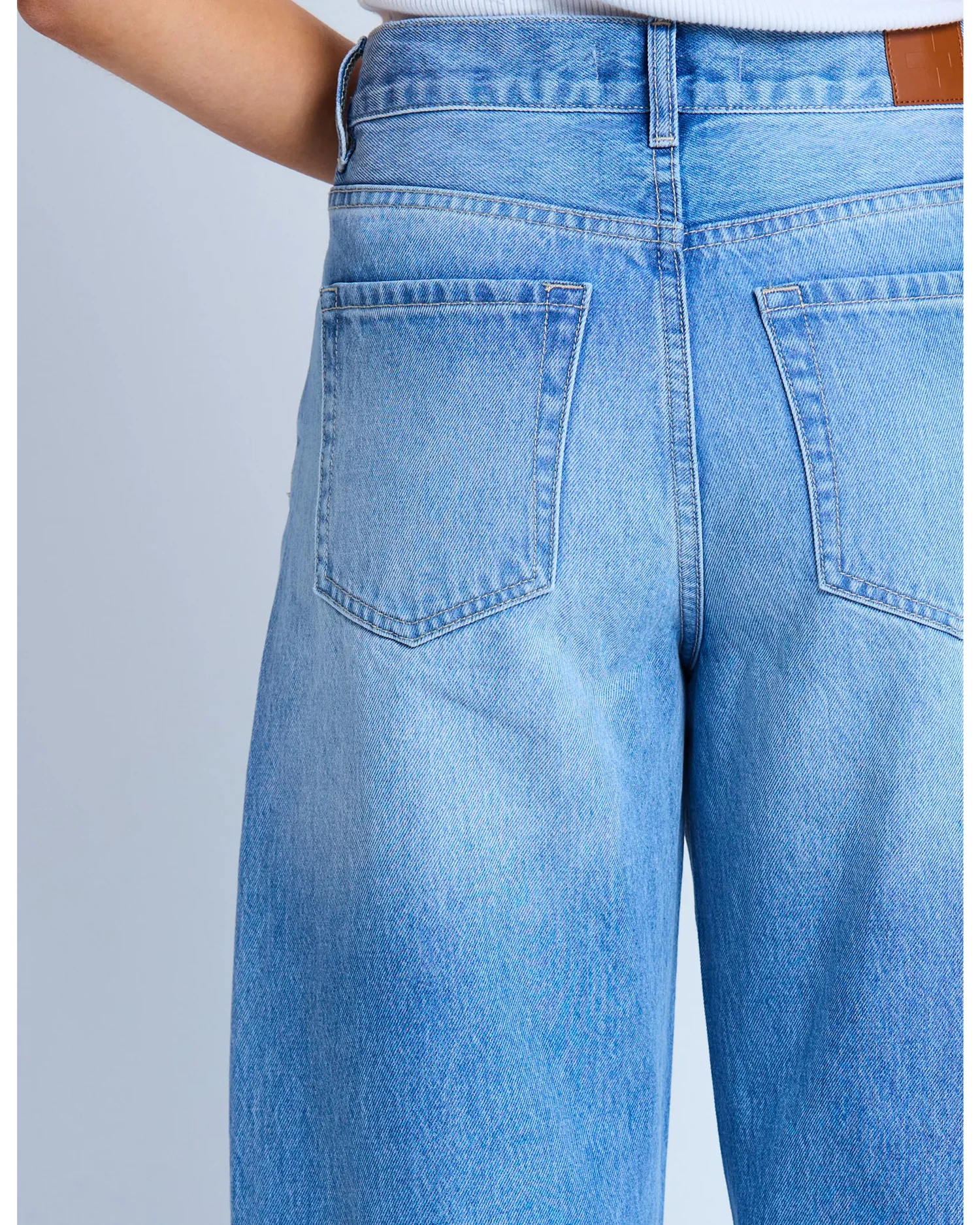 Ankle length barrel leg jean with zip fly and inner knee seam tuck detail.