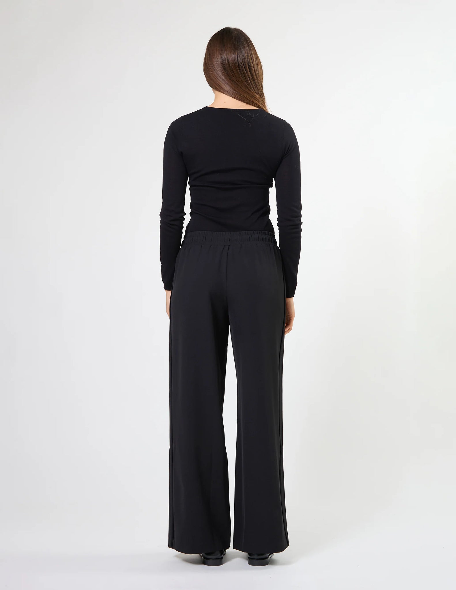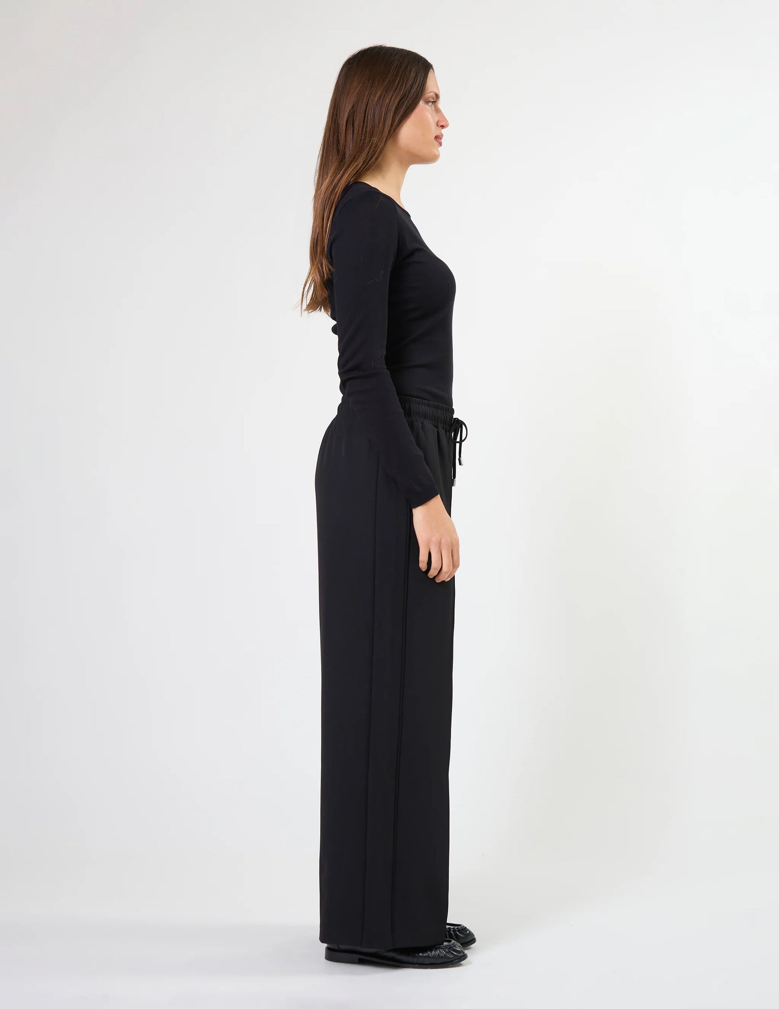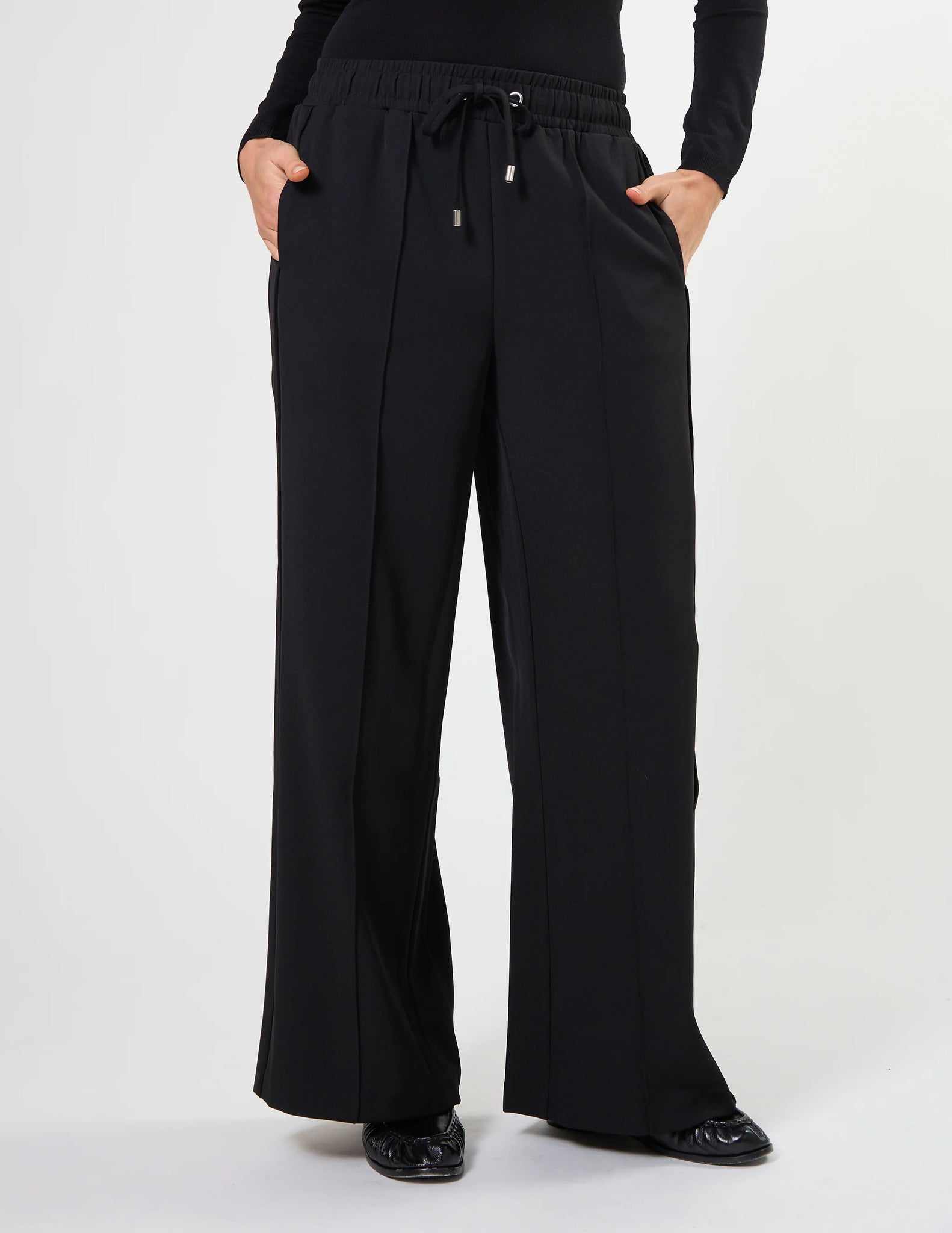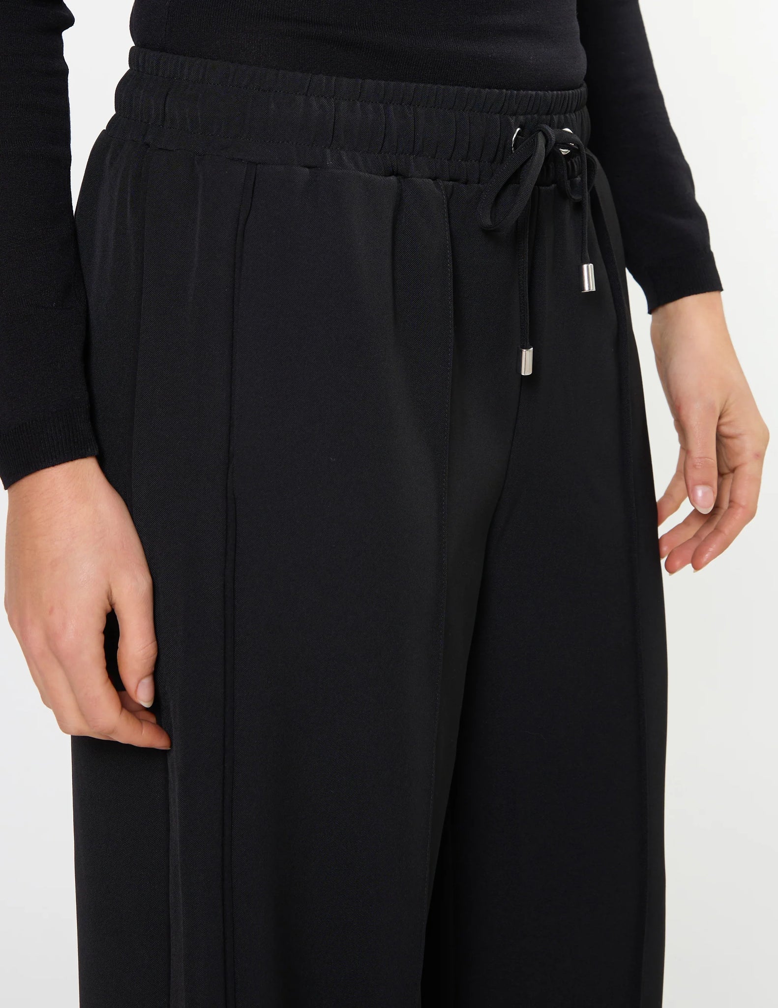 Elasticated waist pant with centre front pintuck down legs, metal eyelets & self fabric tie with metal tips. Contrast colour flat pipe down side legs.