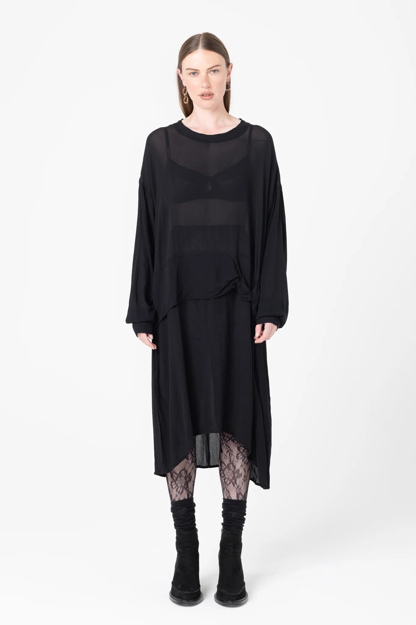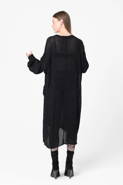 Long sleeve dress in sheer viscose georgette, designed for an oversized fit. A mid-length silhouette with relaxed dropped shoulders it features a wide waistband with a plaited detail, classic neckband, shirt-tailed back and refined sleeve cuffs. Wear it solo or layered with pants, coats and sweaters.