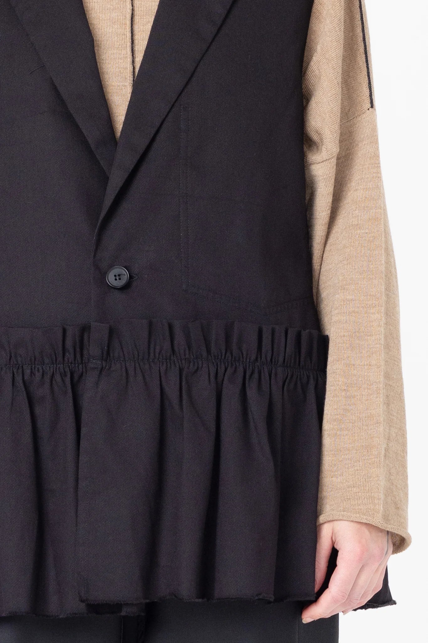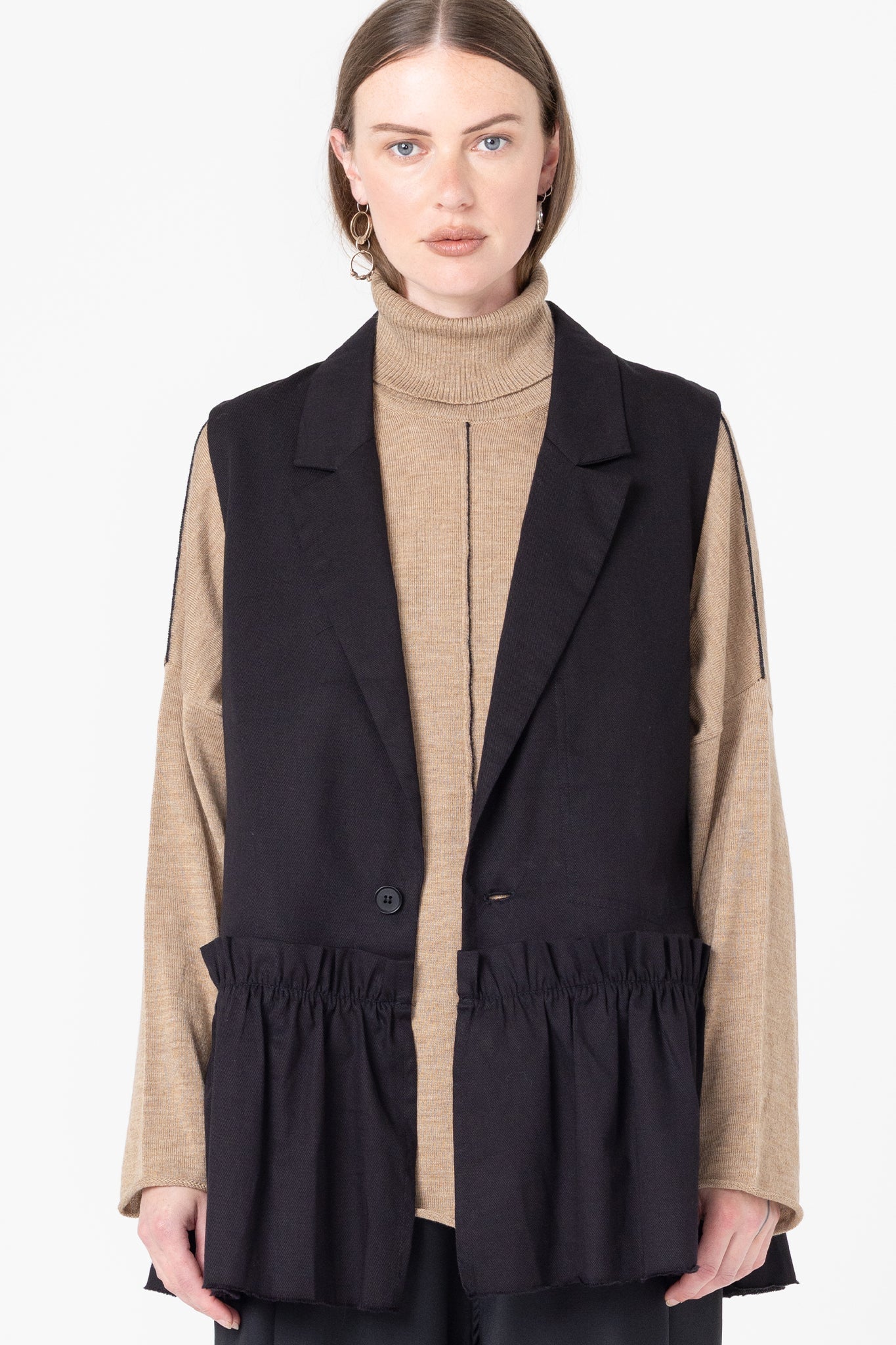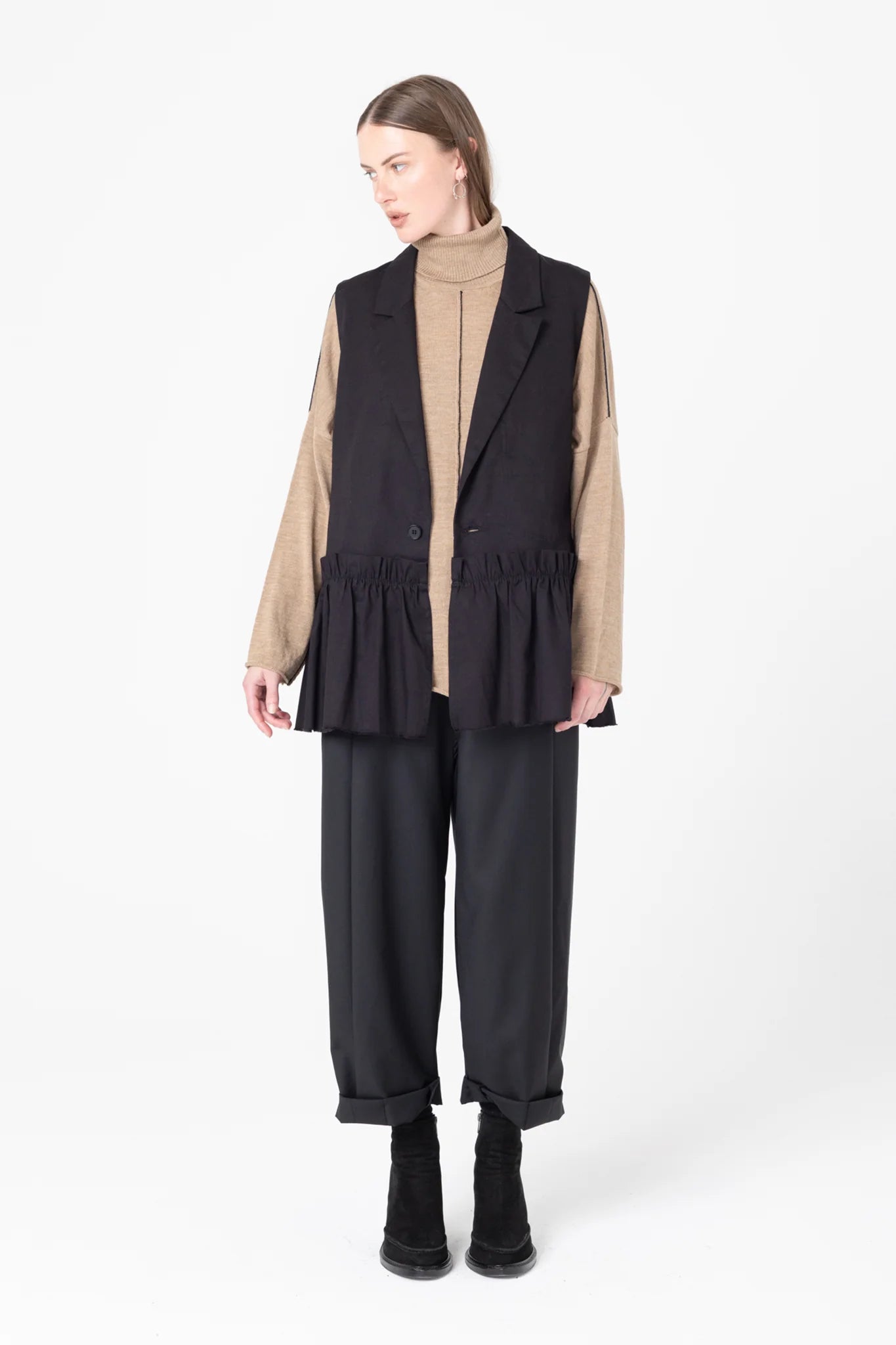 Sleeveless vest in soft cotton cavalry twill (Black Twill), designed for a relaxed fit. A tailored, fully lined vest featuring a collar and lapel, single corozo button closure, internal patch pocket and wide hem frill. A statement layering piece, designed to style over long sleeves, shirts or dresses.
