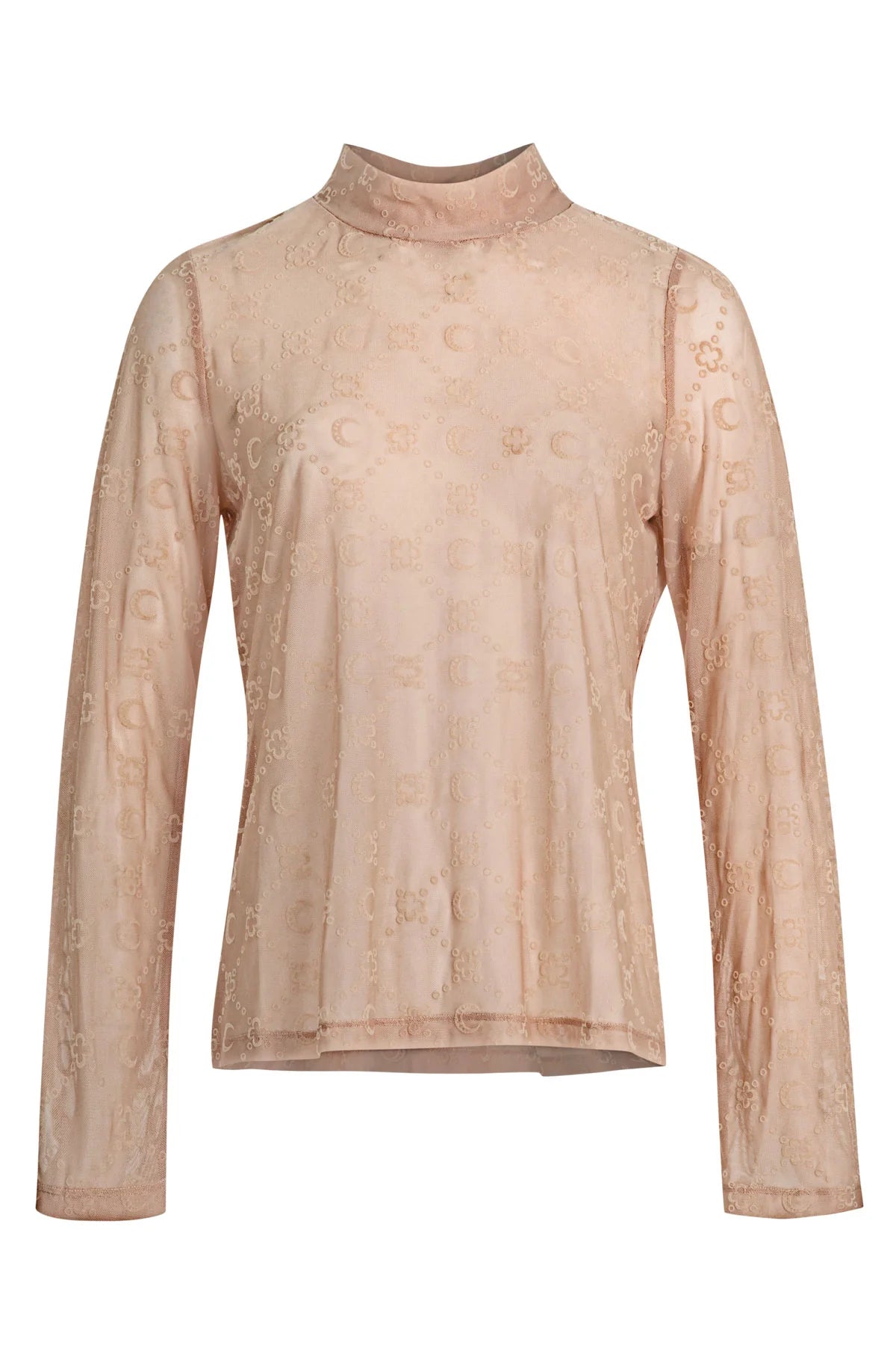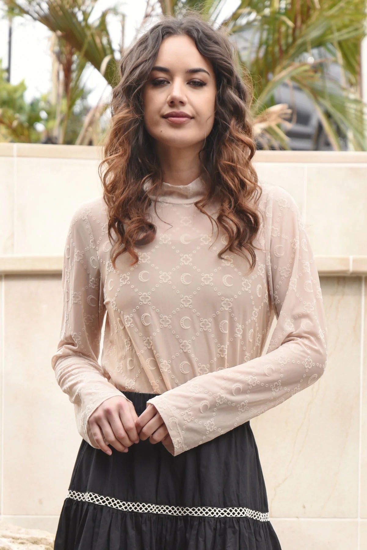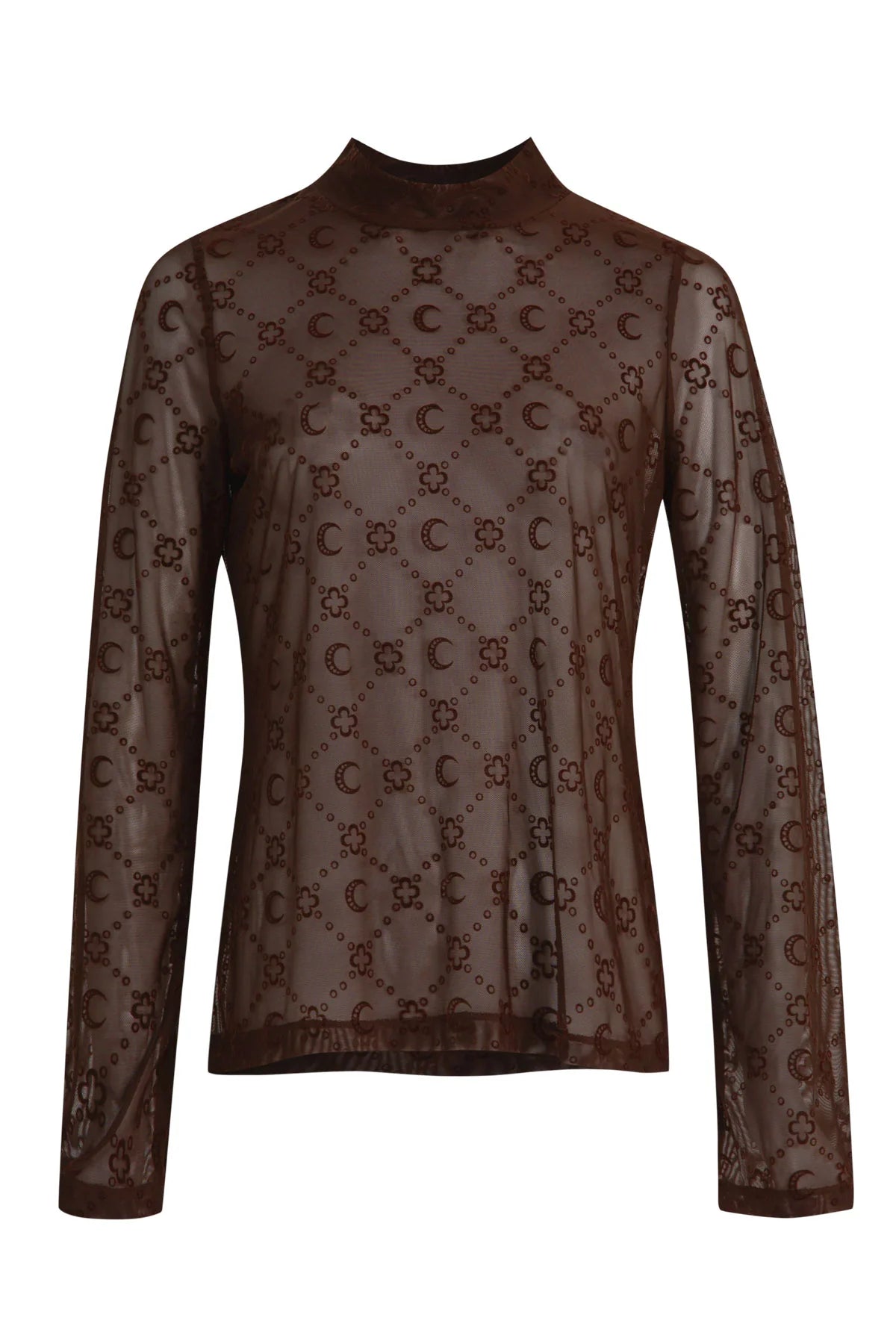 Meet the statement staple you’ll reach for again and again: the 'Don’t Get Meshy' top, crafted in our delicate yet daring 'Sheer Pleasure' flocked mesh fabric. Its sheer mesh base is adorned with a textured flocked monogram pattern, adding depth and intrigue, while the sleek mock neck brings a modern, elevated finish. Light, versatile, and effortlessly chic—perfect for layering or letting it shine on its own.