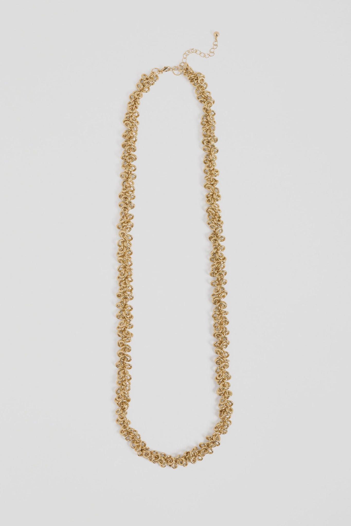 Thick metal jump rings connected together in a layered fashion to form a textured chain. Long length allows for multiple styling options, you can double wrap around neck to form choker or wrap around wrist to wear as bracelet.
