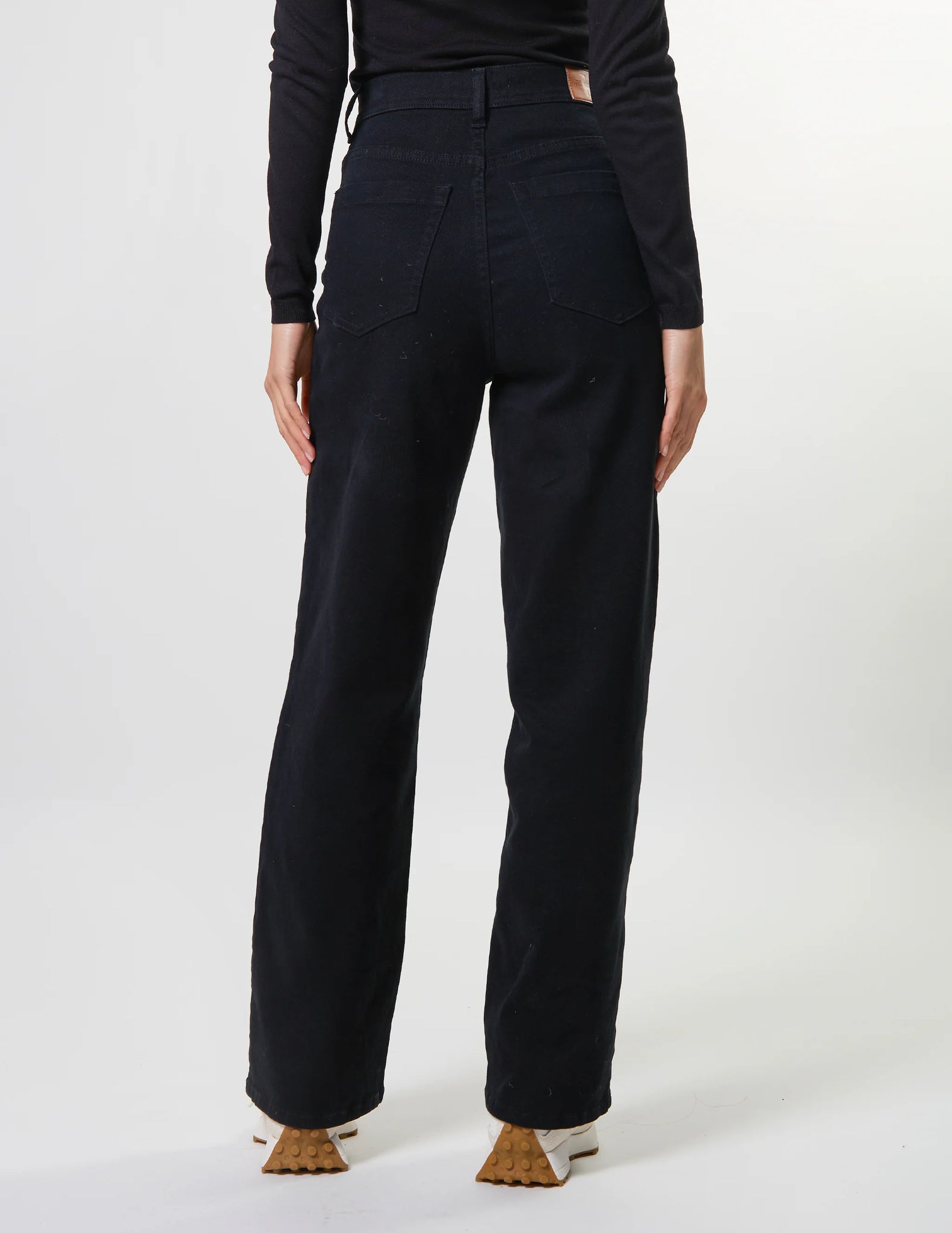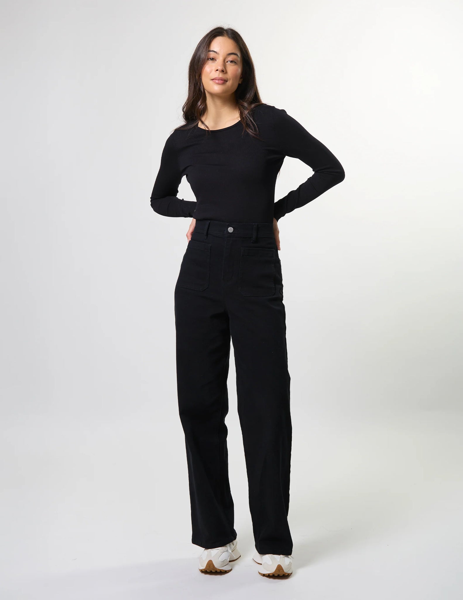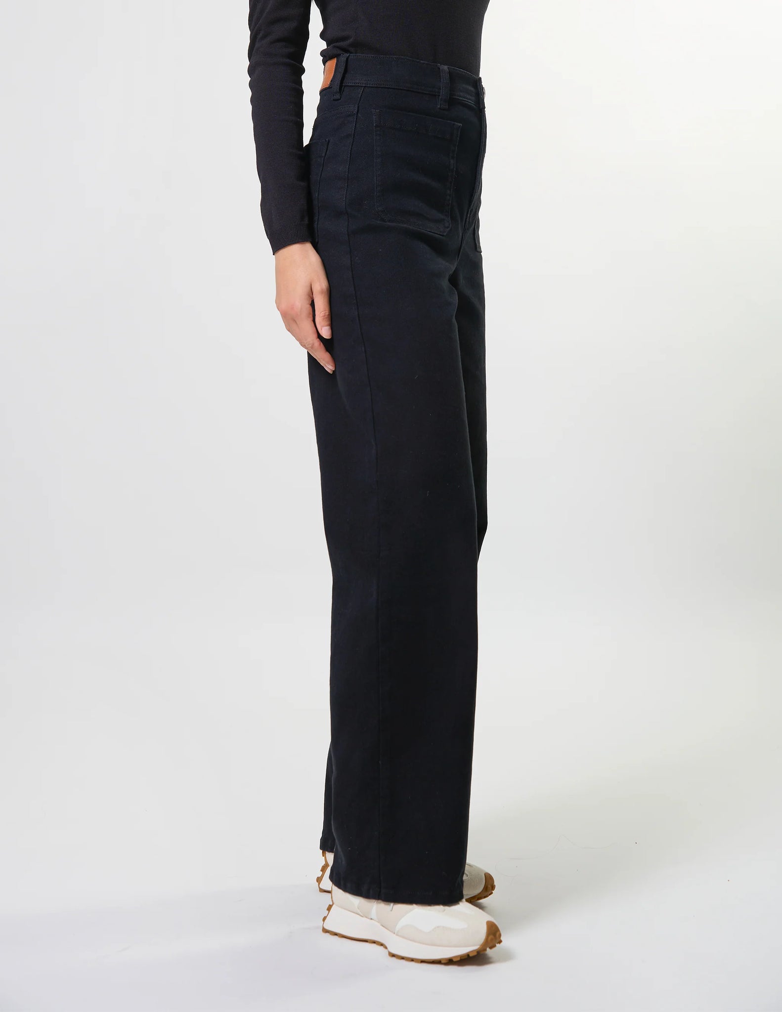 Wide leg full length jean with front patch pockets, back pockets and logo patch on back waistband.
