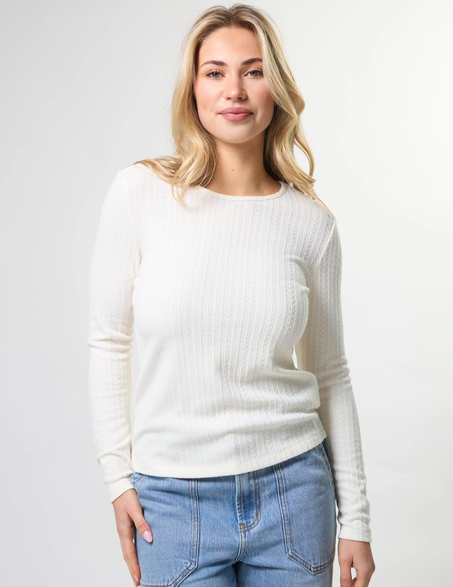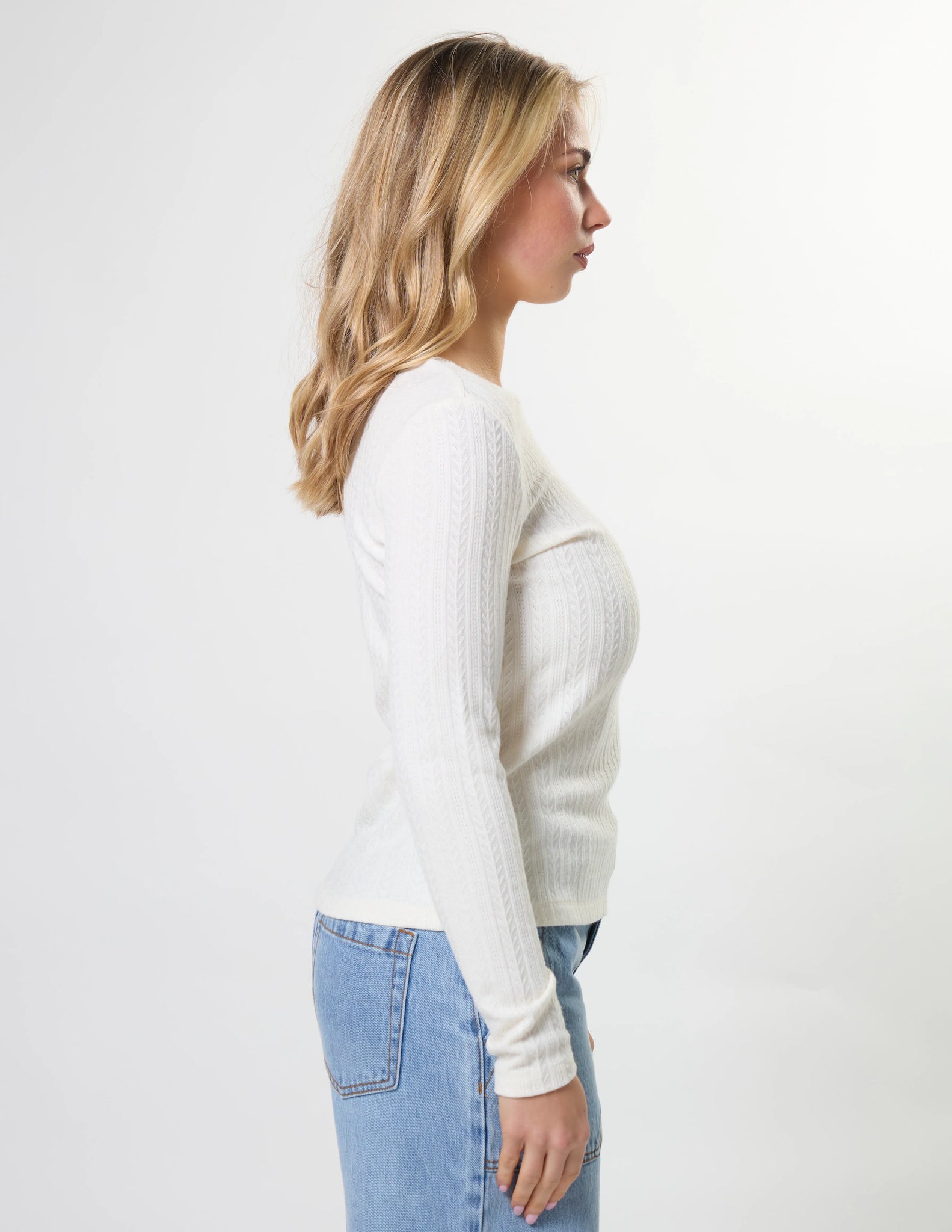 Textured cable pointelle fitted crewneck long sleeve top.