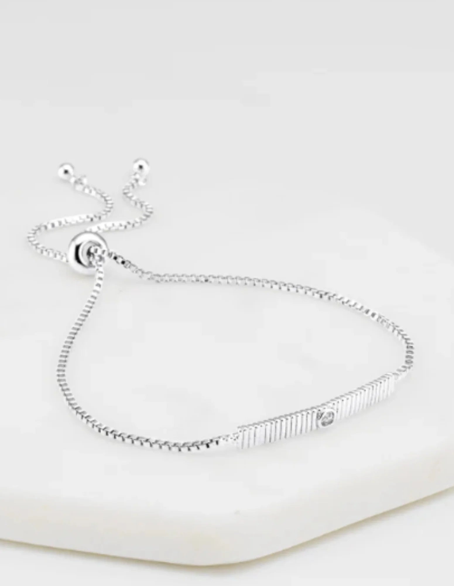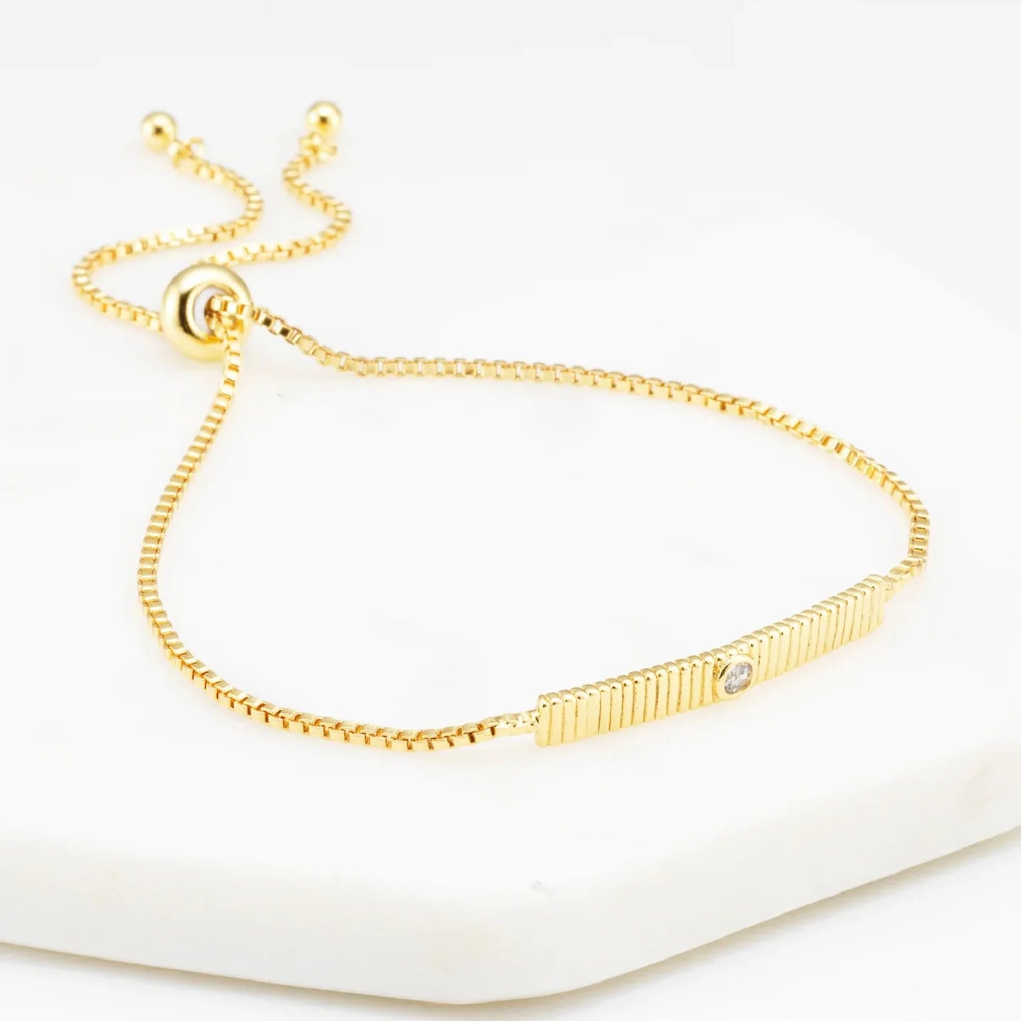 Introducing the Billie Bracelet, a chic and versatile accessory that will enhance any wrist. This adjustable bracelet features a delicate chain and a thin rectangle pendant adorned with a sparkling crystal. The minimalist design of the Billie Bracelet exudes elegance and sophistication, making it suitable for any occasion. With its adjustable length, it offers a comfortable and customisable fit for all wrist sizes. Elevate your style and add a touch of glamour with the Billie Bracelet, a must-have addition to your jewellery collection.