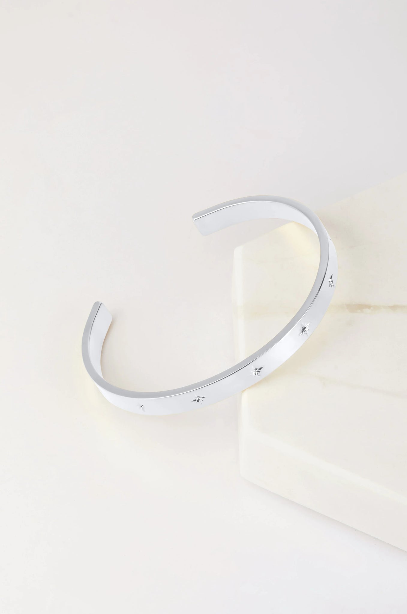This stunning piece features a sleek and stylish cuff design adorned with star-shaped engravings along the outside. The Layla Bracelet effortlessly combines elegance and mystique, making it a versatile accessory for any occasion.